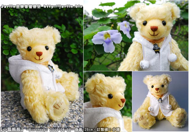 這件手工德國毛海泰迪熊是小鴻訂製送給小雪的生日禮物。小鴻連著兩年都跟Jarlin訂製小熊作為生日禮物送給小雪,去年量身訂製的是雪白色穿著大紅外套的小熊。今年想要做點不同的設計,小鴻說小雪是個性很開朗的女孩,所以Jarlin就幫他用明亮的黃色表達陽光開朗的感覺,腳底繡著小雪的名字。而純白色的連帽背心則是要表達[雪]的感覺。