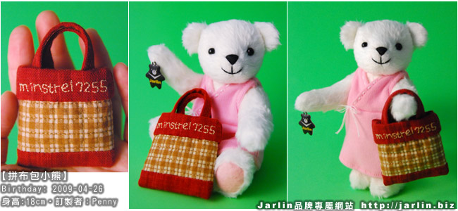 這隻熊熊會拿著小拼布包,是因為Minstrel喜歡做拼布包,這個小包包也是依照Minstrel曾經做過的一款拼布包所設計的唷!小小的拼布包拿在手上很精巧。熊熊提著小拼布包要開心上街Shopping了~