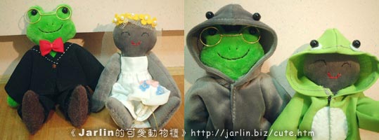 milly訂製的,她是蝌蚪,老公是青蛙,製作了兩套服裝:新郎新娘裝與變身裝,可以將自己變成對方。