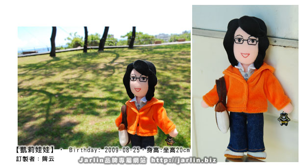 薺云訂製給同學凱莉的Q版娃娃,娃娃穿著的白領灰色衣服是她們學校慈濟大學的制服,這是凱莉平常在學校生活的打扮。這天Jarlin剛好要去花蓮著名景點松園別館,所以也特別帶娃娃在松園別館拍照,薺云說她們兩也都來過這兒看風景。