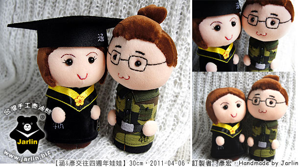 彥宏在2008年開始向Jarlin訂製他與涵的交往紀念娃娃。每年都依照當時他們的髮型,喜歡的穿著,還有生活的不同階段來製作具有紀念價值的專屬娃娃。今年二月份收到彥宏再次的來信,寫到:[去年因為是研究所最忙的一年,所以把三周年空了過去,之後再補沒關係。 受到交往週年娃娃的祝福,已經要交往滿四年了,因此這次要訂做「交往四週年的娃娃」。今年對我們而言最重要的事情有兩件,分別是〝碩士班畢業〞及〝我要當兵〞,剛好可以拿來當這次做娃娃的主題。]