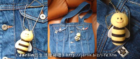 Angel請我幫她的牛仔外套改裝成手提袋,配上一隻可愛的小蜜蜂吊飾,她說這隻小蜜蜂長得很像她快滿七個月的寶貝女兒唷!