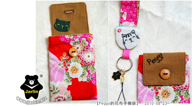 以大紅花布做成手機袋,搭配有貓咪圖案的手機吊帶,可以掛在脖子上隨身攜帶手機。