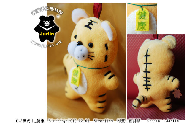 鮮黃的小老虎,身上的斑紋都是Jarlin 一針一線慢工細活繡出來的,呈現可愛的虎紋。