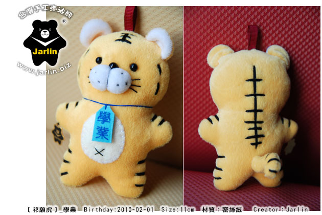 鮮黃的小老虎,身上的斑紋都是Jarlin 一針一線慢工細活繡出來的,呈現可愛的虎紋。