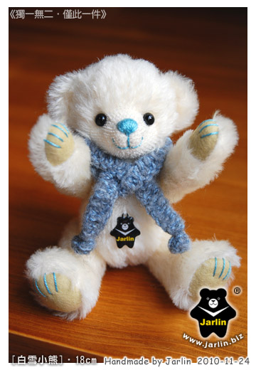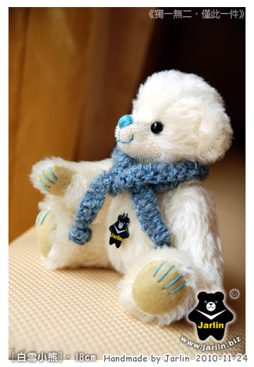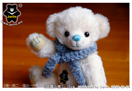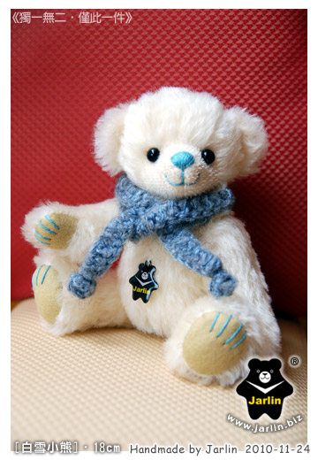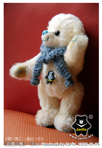 全身是米白色毛茸茸的毛海,搭配可愛的藍色鼻子、嘴巴、爪子,還有灰藍色的手勾圍巾,整體是簡單舒服的配色。