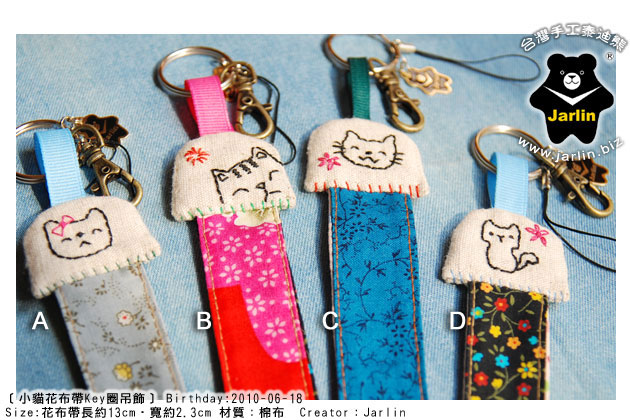 選購時請您註明要訂製的是A、 B、C、D 中的哪一款貓咪圖案。花布帶部分您可以按照原本Jarlin搭配好的設計,也可以在這四款花布中選擇自己喜愛的花色來搭配,目前A是搭配灰藍底花布,B是紅底花布,C是藍底花布,D是黑底花布。
