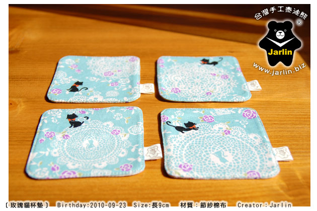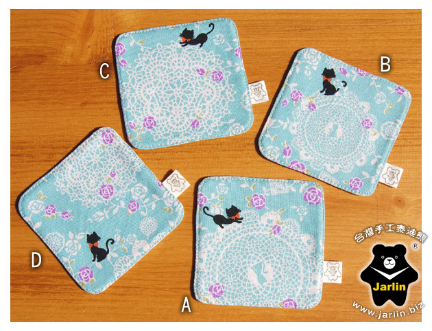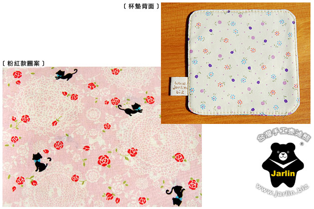 介紹:杯墊正面是有著可愛貓咪花圖案的節紗綿布,中間襯著柔軟的薄舖綿,背面底布是棉質印花綿布,兩面皆可使用。