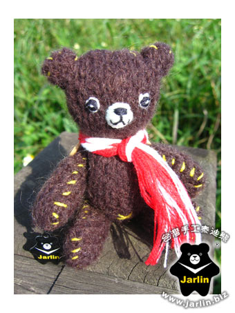 熊熊主體為深咖啡色,用黃色毛線縫製,搭配紅白毛線圍巾,給人溫暖的聖誕氣息。