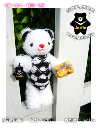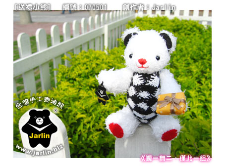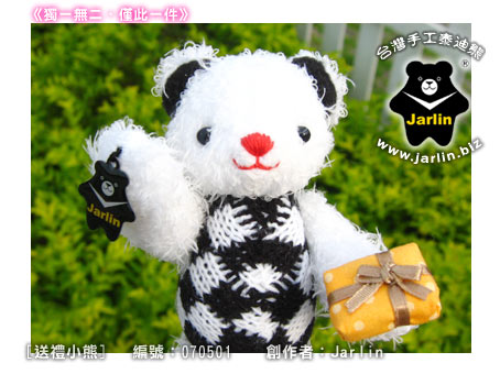 特殊的黑白格紋編織布,配上鮮艷的紅色,形成搶眼的對比。手上拿的小禮物也是Jarlin手工製作的,黃底白圓點的包裝是印花棉布,搭配金棕色的緞帶,做出的小禮物很精緻。