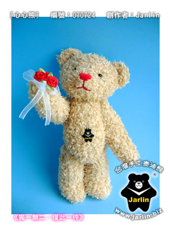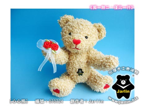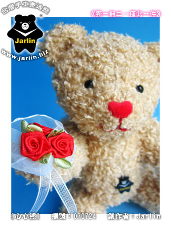 介紹:金色的熊熊搭配紅色的愛心及捧花點綴,雖然配色簡單卻很耀眼。三朵紅色玫瑰傳達[我愛你]的心意!